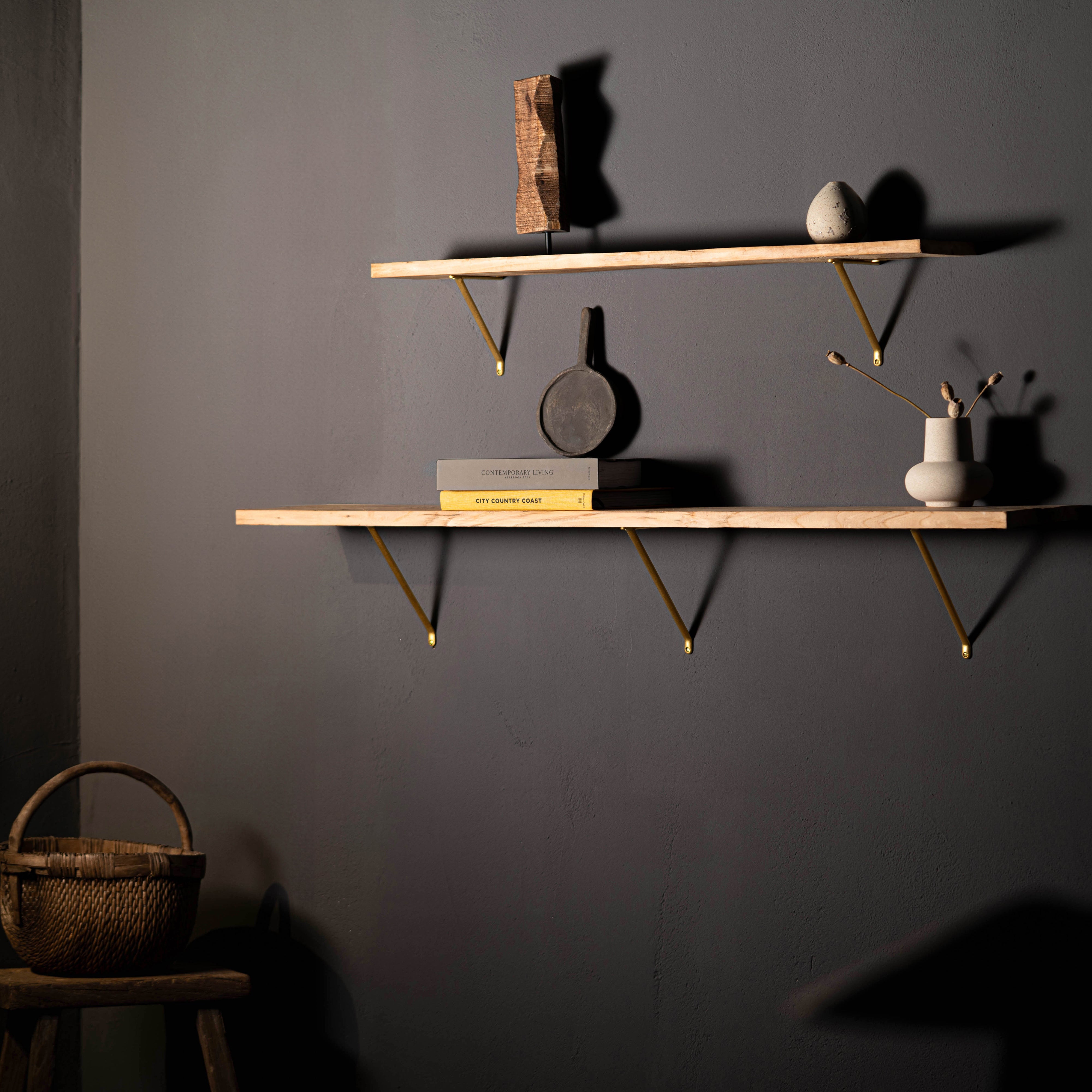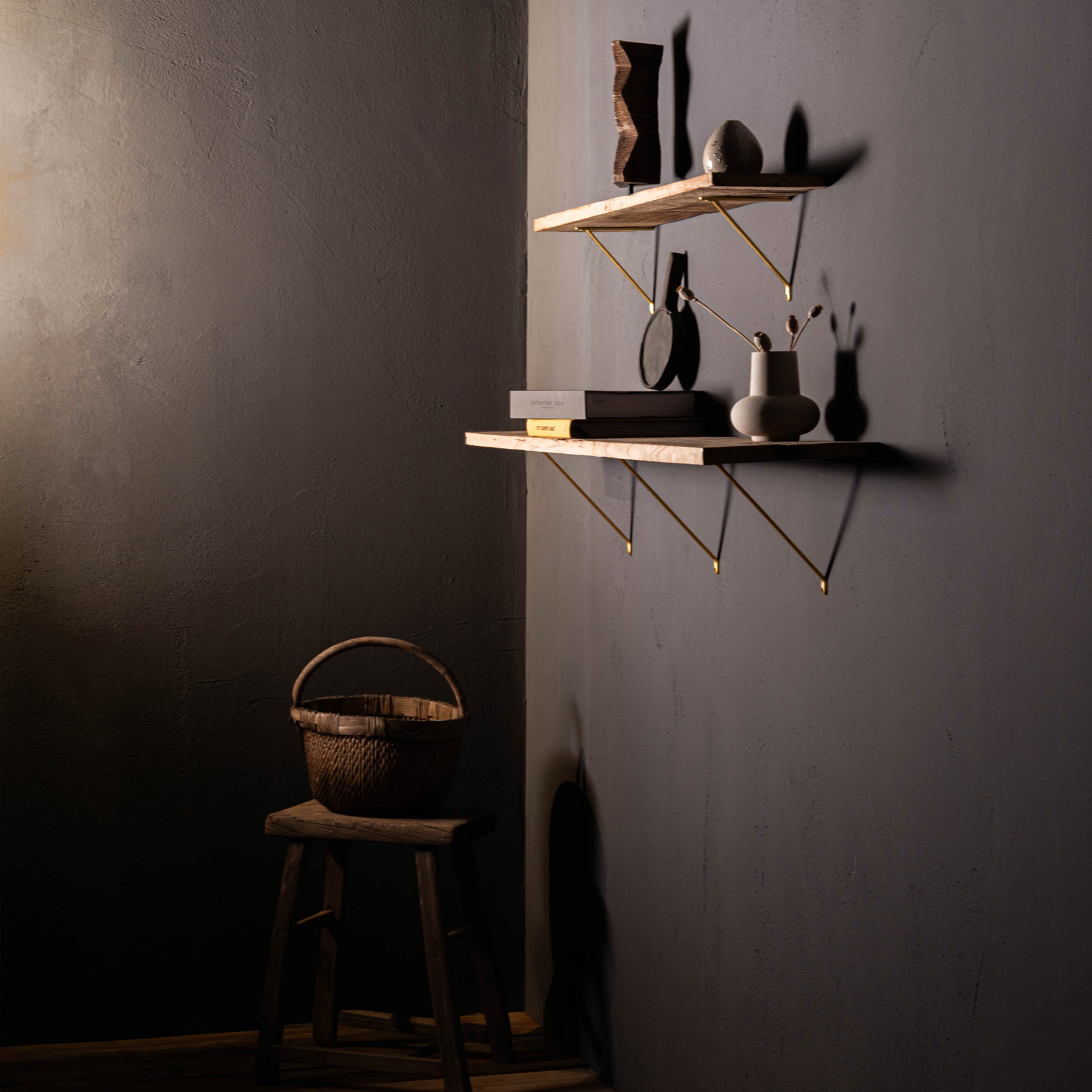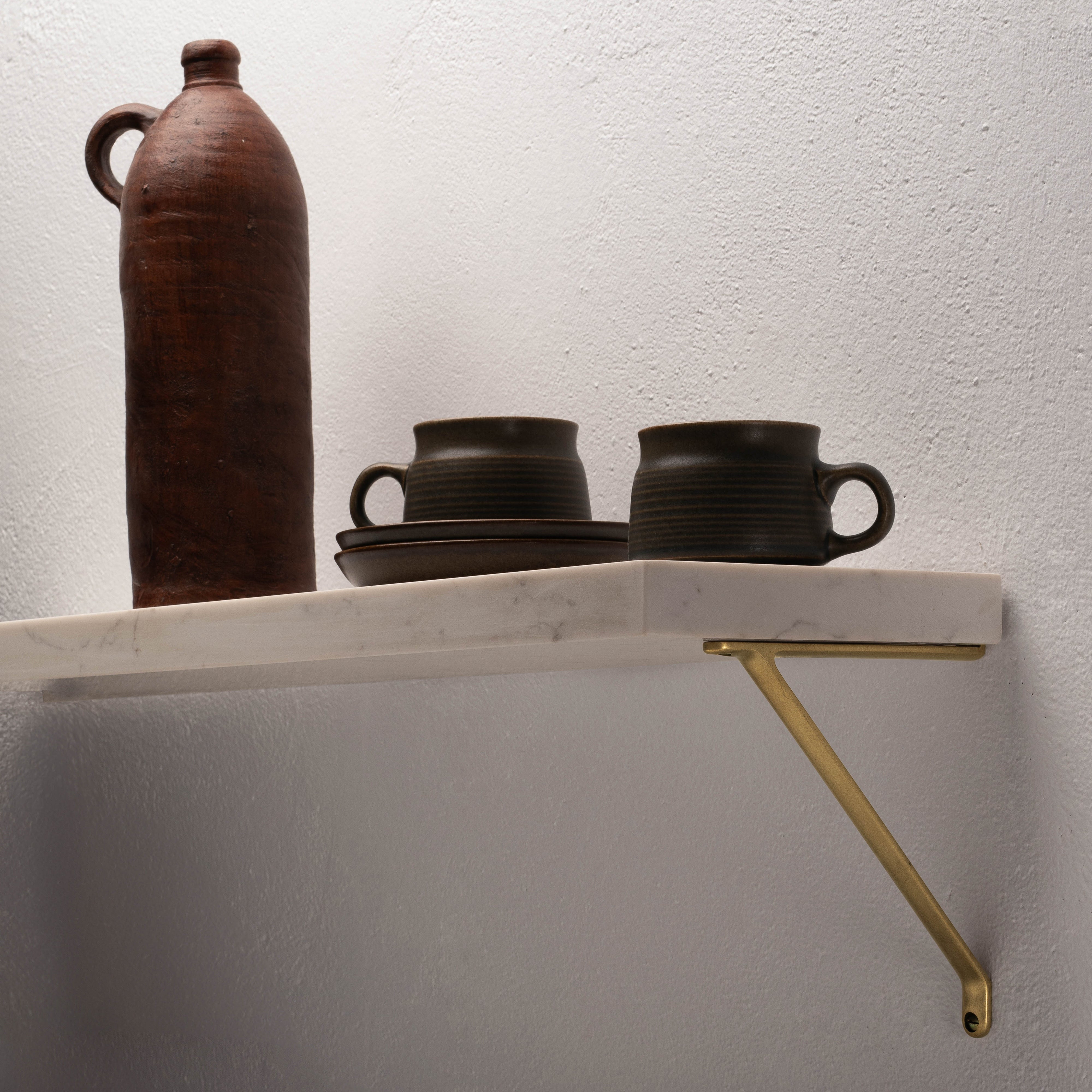Unsere Brixton-Regalhalterung ist aus einem einzigen Stück robusten, massiven Messings gegossen und sitzt bündig an der Wand. Die Regalhalterung hat eine Lastgrenze von 40 kg.